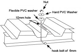 The hole must be made with an electric or hand drilling machine. The size of the diameter must be 4mm bigger than the size of the fixture element, and done in the top of the wave of the corrugatio.